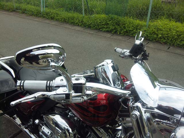 FLHRSのハンドルバーと比べると物理的に5cmほど遠いです。