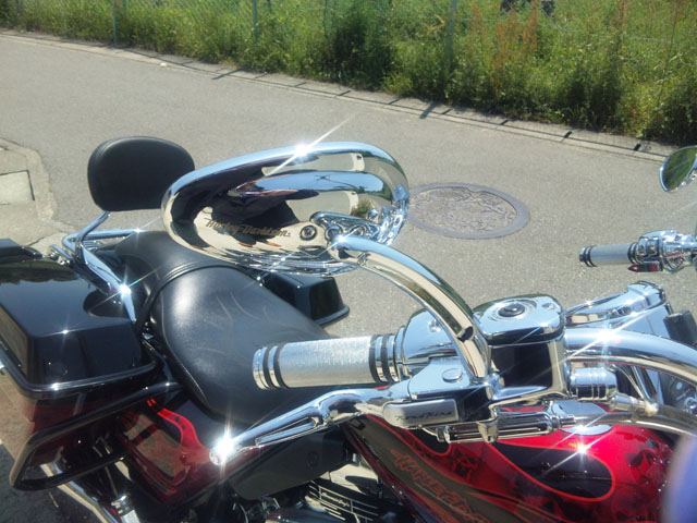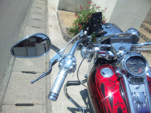 FLHRSのハンドルバーと比べると物理的に5cmほど遠いです。
